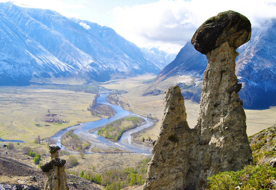 Долину реки Чулышман, самого большого из притоков Телецкого озера, нередко сравнивают с Гранд-Каньоном в США. Величественные горы, глубокие ущелья – это одно из самых впечатляющих мест Южного Алтая. Среди чудес долины – каменные грибы, глиняно-песчаниковые столбы высотой до 7 метров, увенчанные «шляпками» из более прочной породы.
