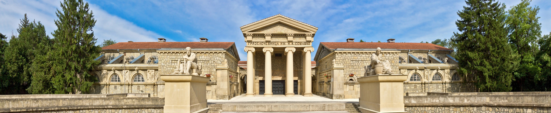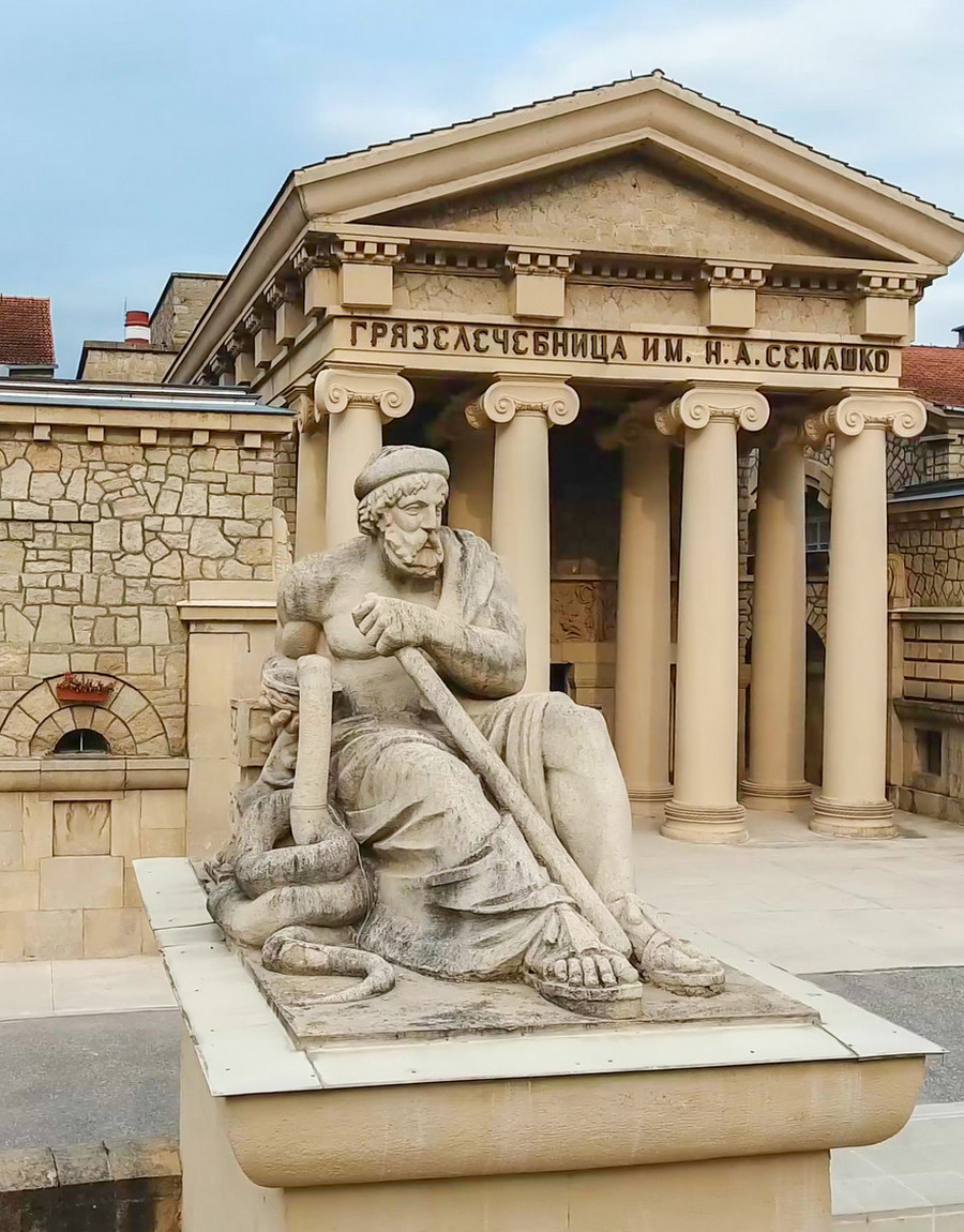 Здание грязелечебницы – одно из самых грандиозных и красивых зданий города. Оно было построено в 1915 году по проекту архитектора Евгения Шреттера в стиле древнеримских бань-терм и украшено скульптурами и барельефами на античные темы. У главного входа восседают древнегреческий бог врачевания Эскулап (Асклепий) и его дочь Гигиея – богиня чистоты и здоровья (отсюда термин гигиена). Первоначально грязелечебница была названа в честь цесаревича Алексея – Алексеевской, но с 1923 года она носит имя советского наркома здравоохранения Николая Александровича Семашко, который руководил ее восстановлением после Гражданской войны.