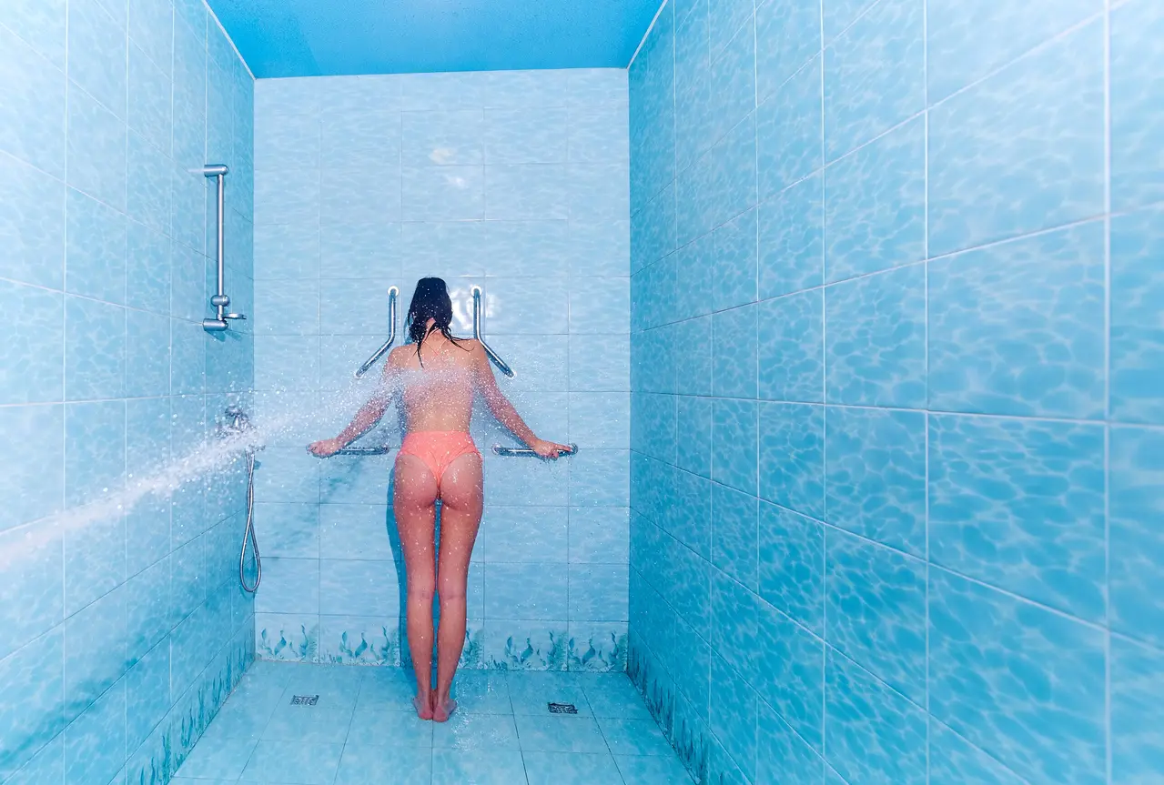 Особенности процедуры. Мощные потоки воды под высоким давлением направляются прямо на позвоночник и ноги, сначала охлаждая тело холодной водой, затем плавно переходя к тёплым температурам, далее меняя горячий и холодный режимы.