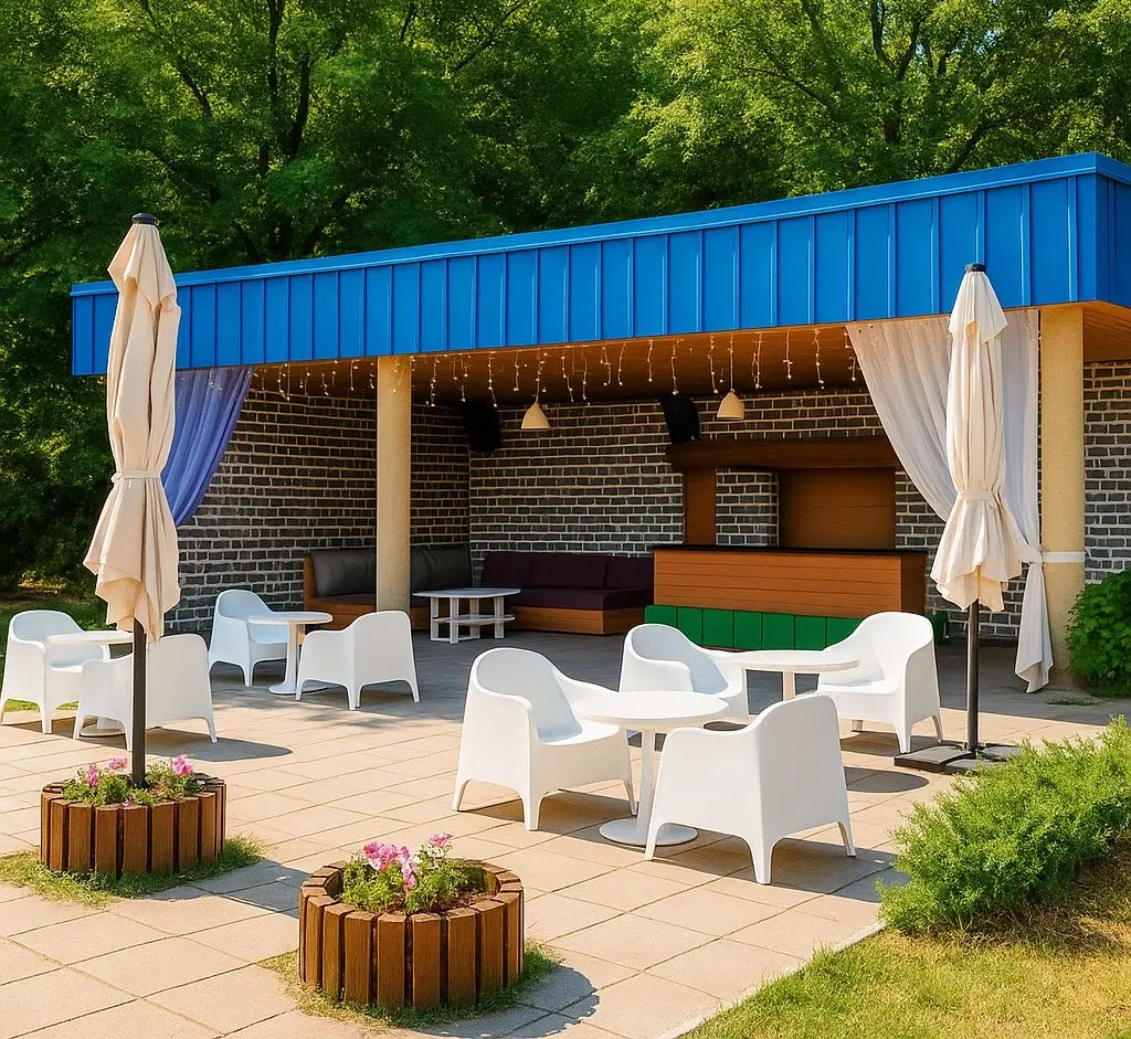 Работает летнее кафе и уютный павильон с мороженым.