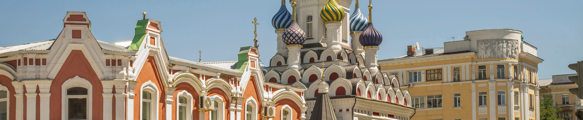 Нарядная шатровая церковь с разноцветными куполами напоминает уменьшенную копию собора Василия Блаженного в Москве. Она была построена в 1906 году при архиерейском доме и с тех пор практически не изменилась.