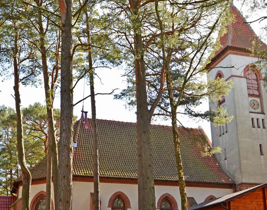Лютеранскую кирху на высоком холме среди сосен построили в начале прошлого века. Внутренний декор, в том числе и красивый резной алтарь, к сожалению, не сохранился, но внешне кирха почти не изменилась. На башне-колокольне сохранились часы и горельеф Девы Марии.