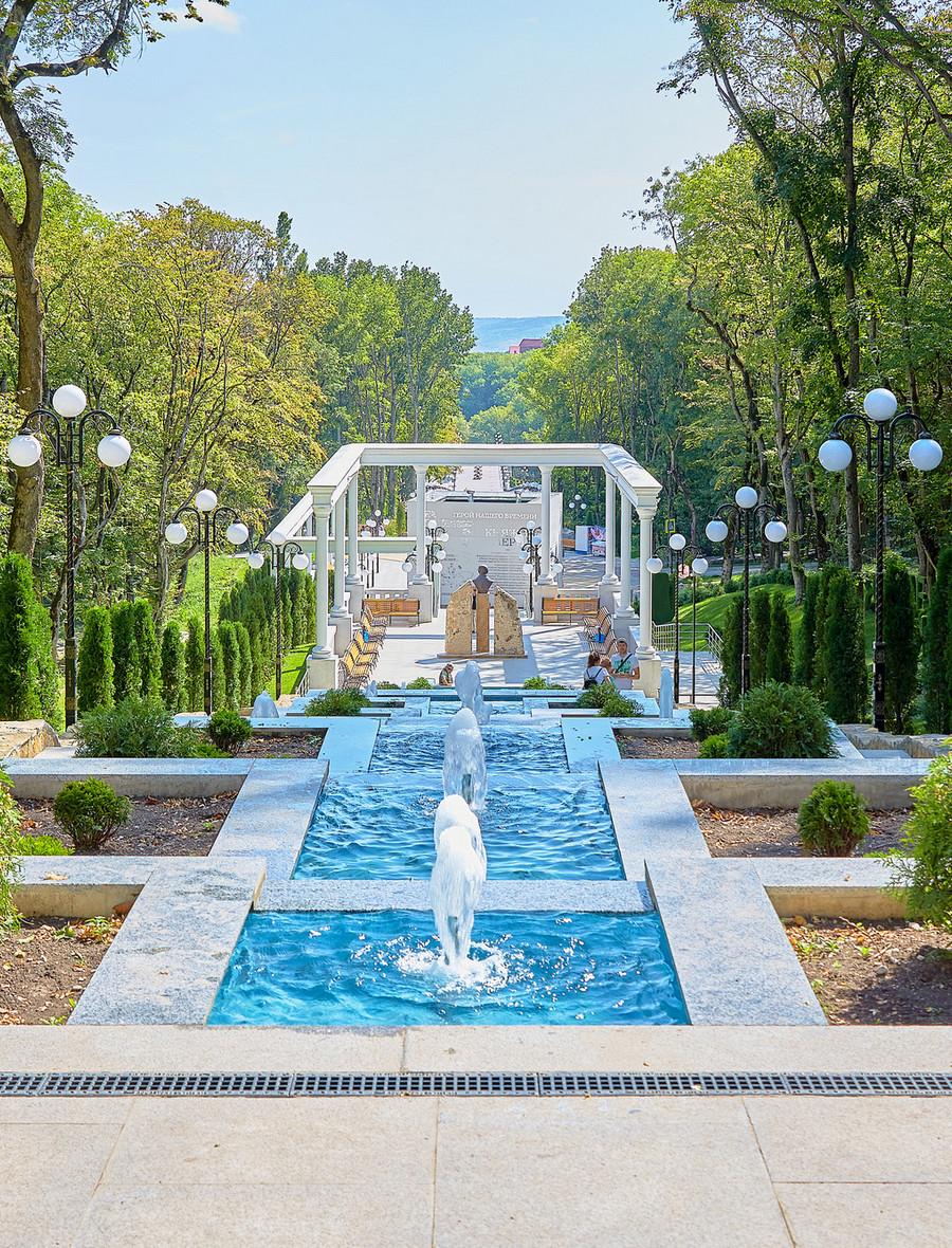 Пролеты лестницы украшены фонтанами и цветниками, на площадках установлены памятники-барельефы, посвященным выдающимся людям, оставившим след в истории курорта: Александру I, А. С. Пушкину, генералу А. П. Ермолову, М. Ю. Лермонтову, Л. Н. Толстому. Есть здесь и бюст Ф. П. Гааза первооткрывателя кавказских минеральных вод. На ступеньках самой верхней части цитируются строки из его книги «Мое путешествие на Александровские воды», написанной в 1811 году. В каскадных фонтанах изначально текла минеральная вода – ради ее отвода и была, собственно, построена лестница. Сегодня вода в фонтанах – самая обычная, а минеральную (аналогичную воде «Ессентуки № 4») можно попить в бювете «Книга», устроенном в центральной части лестницы.
